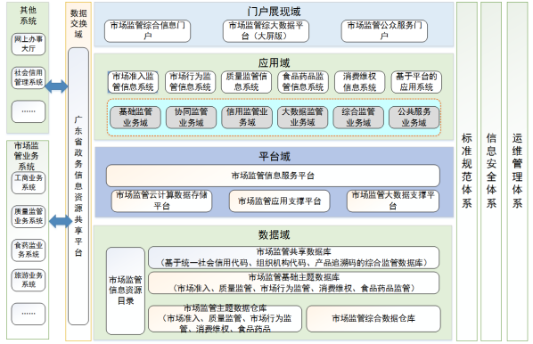 市场监管信息平台框架,由数据域、平台域、应用域、门户展现域、数据交换域、标准规范体系、信息安全体系、运维管理体系等部分组成。