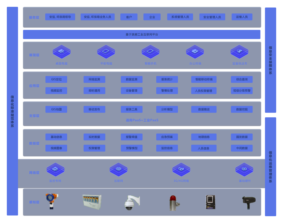 应用层:顺利获得平台的搭建,主要面向石油、化工、冶金等不同行业的不同业务流程,给予GIS定位、数据监测、警情处理、设备管理等相关的应用,为相关人员随时随地关注安全状况和污染情况,对企业全方面的有效管理。