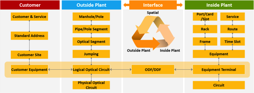 By integration with OSP system, IM provides strong capability to manage all domains in customer’s telecom network and then compose E2E view by global topology diagram crossing inside and outside plant, from access layer to transmission layer.
