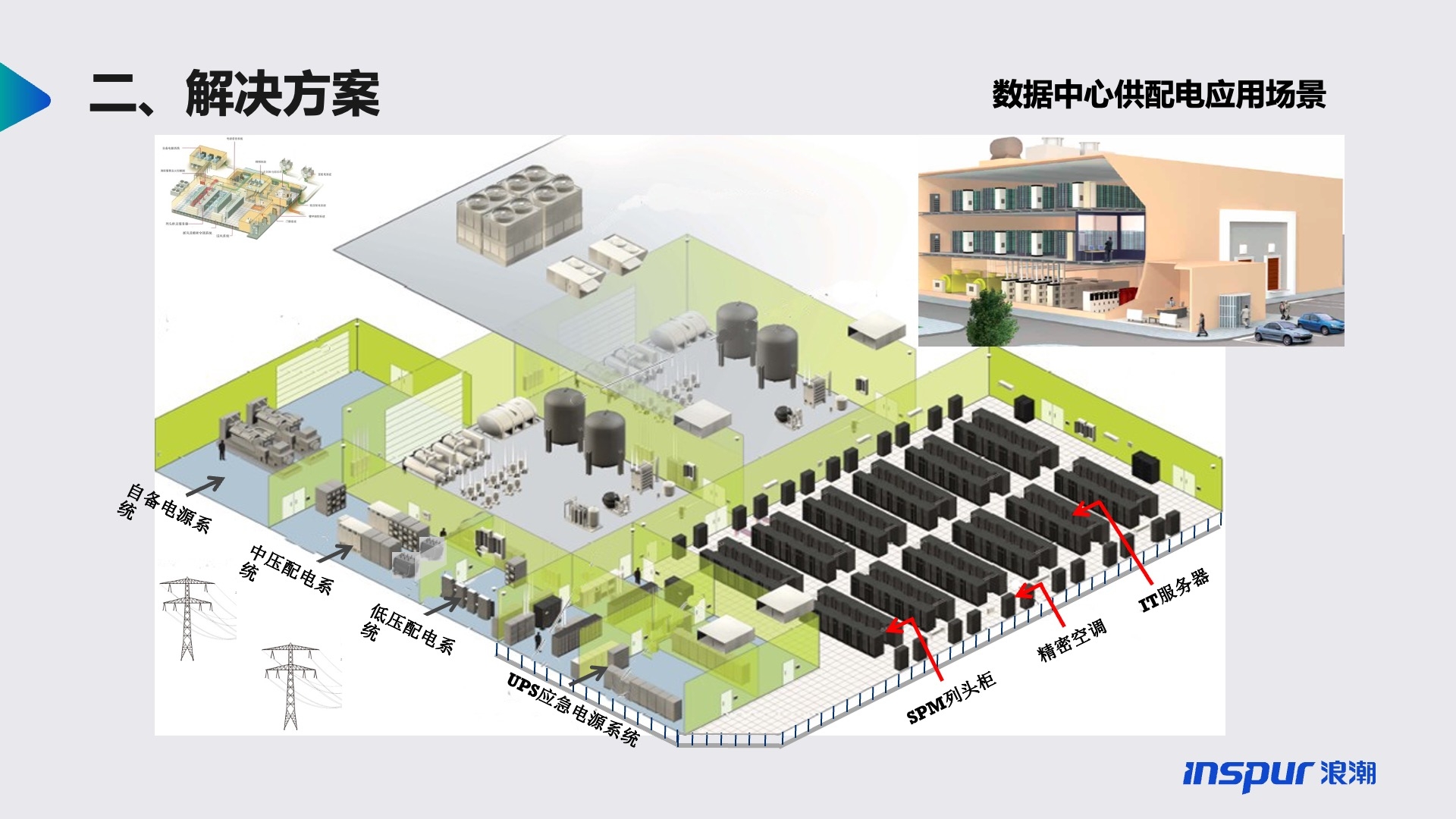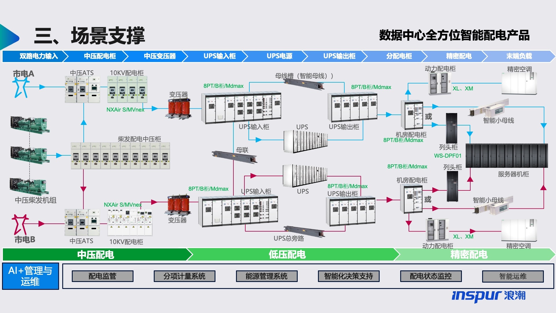 数据中心供配电系统是从电源线路进用户起经过高/低压供配电设备到负载止的整个电路系统,将主要包括:高压变配电系统、柴油发电机系统、自动转换开关系统(ATSE)、输入低压配电系统、不间断电源系统(UPS,Uninterruptible Power System)系统、UPS列头配电系统和机架配电系统、电气照明、防雷及接地系统。其他如:光伏、储能等可作为补充系统。